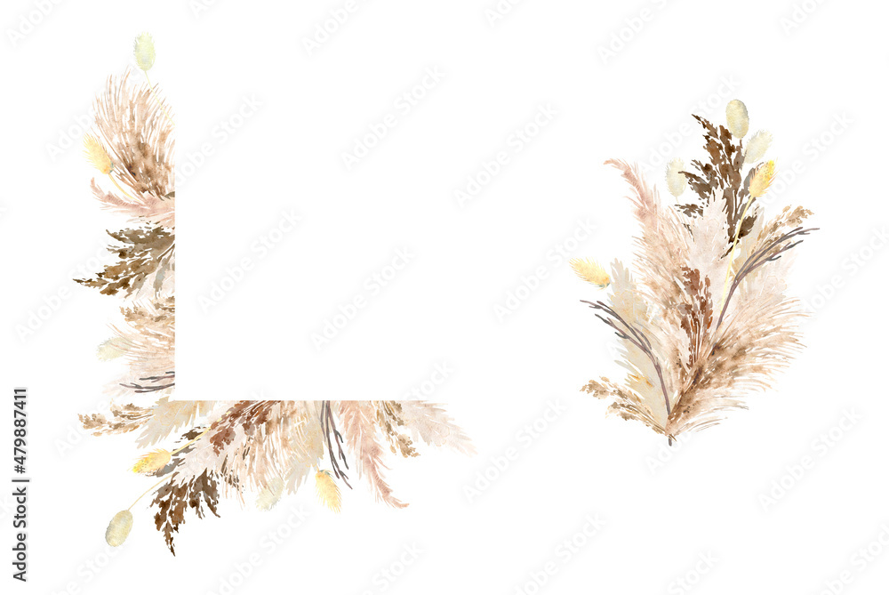 Pampas Grass Border Painted With Watercolor Boho Dried Grass Neutral Colors Set Botanical Nature Design Isolated On White Bohemian Style Wedding Invitation Greeting Card Postcard Stock Illustration Adobe Stock
